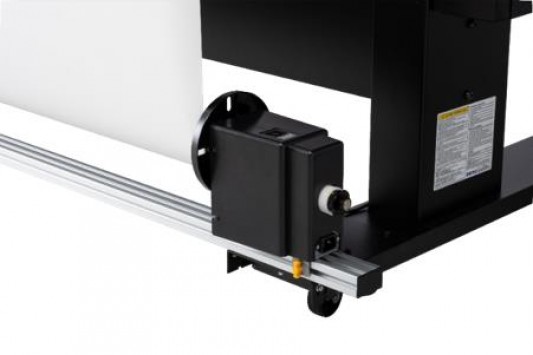 This model supports a take-up unit (for media up to 30 kg) that starts and stops winding with to the printing.