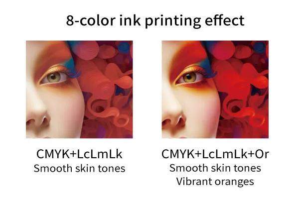 Chuyển màu tự nhiên và dải màu mở rộng với 8 màu mực (CMYK + Lc, Lm, Lk, Or)